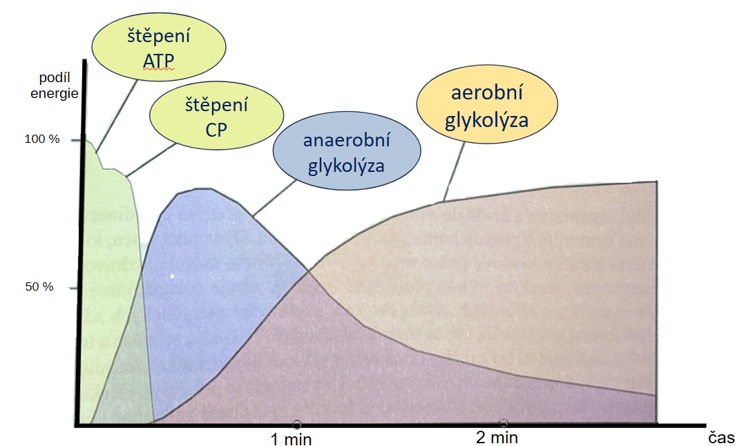 Zatím jsme tedy ve fázi úplného začátku výkonu. Je jedno, jestli je to sprint, nebo lehký běh – změna uvnitř organizmu oproti předchozí klidové situaci je výrazná a organizmus proto rozjede systém na maximální potenciál – využije zásobu ATP, protože je připravena k okamžitému použití. Současně aktivuje v pořadí další nejdostupnější zdroj energie – sacharidy ve formě glukózy. Přeměna ATP z glukózy však zabere několik vteřin, tu dobu vykryje tzv. ATP-CP systém, kde CP je kreatin fosfát. Proces je jednoduchý – ATP (adenosintrifosfát) dá energii aktinu a myozinu s použitím jednoho fosfátu. Tím vznikne ADP (adenosindifosdát), který do použitelné podoby ATP doplní CP tím, že mu předá jeden fosfát. Tento koloběh trvá jen jednotky vteřin, ale stačí to na to, aby ve svalech nedošlo ATP, než se plně rozvine glykolýza.